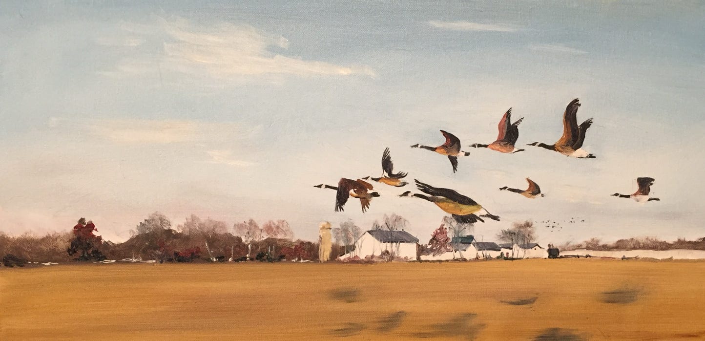 “Geese at Pritzgers Farm - 24 x 12 oil on Canvas Board - $280.00