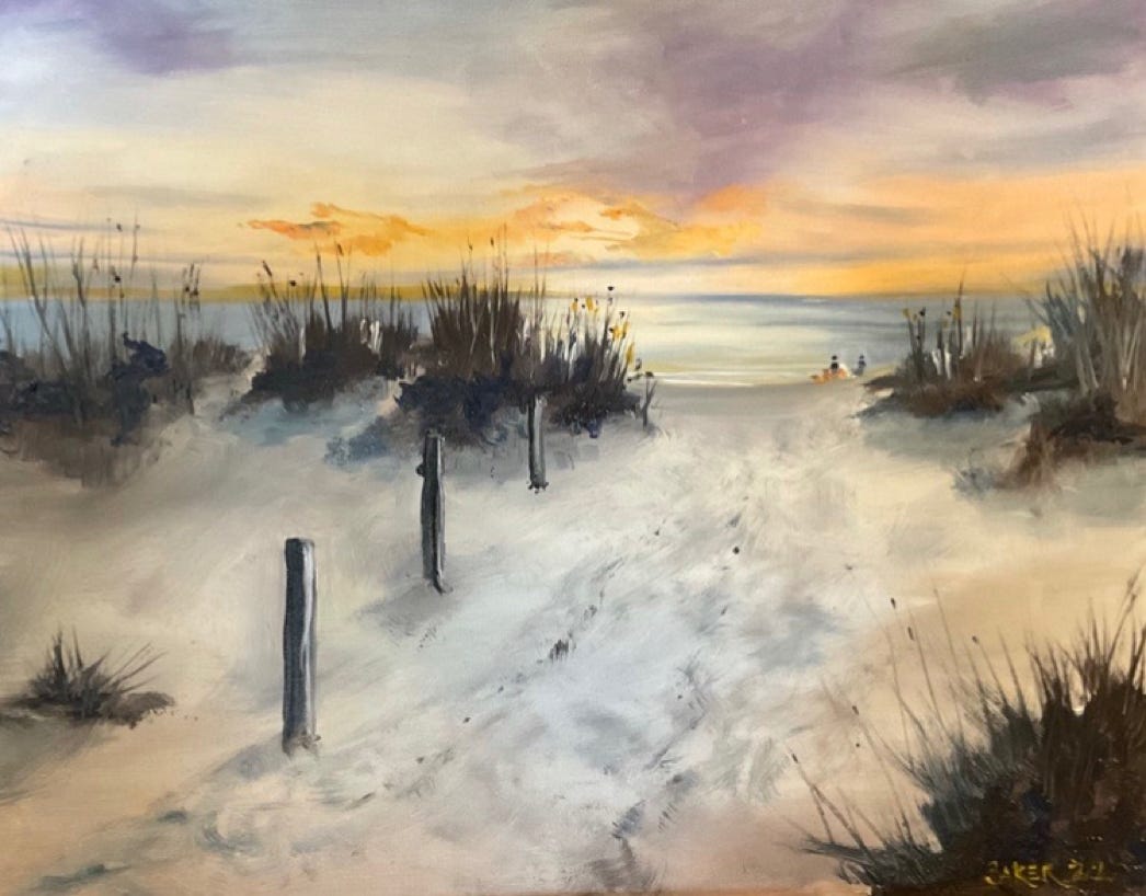“Morning Beach Walk” 20 x 16 oil on canvas board $320.00